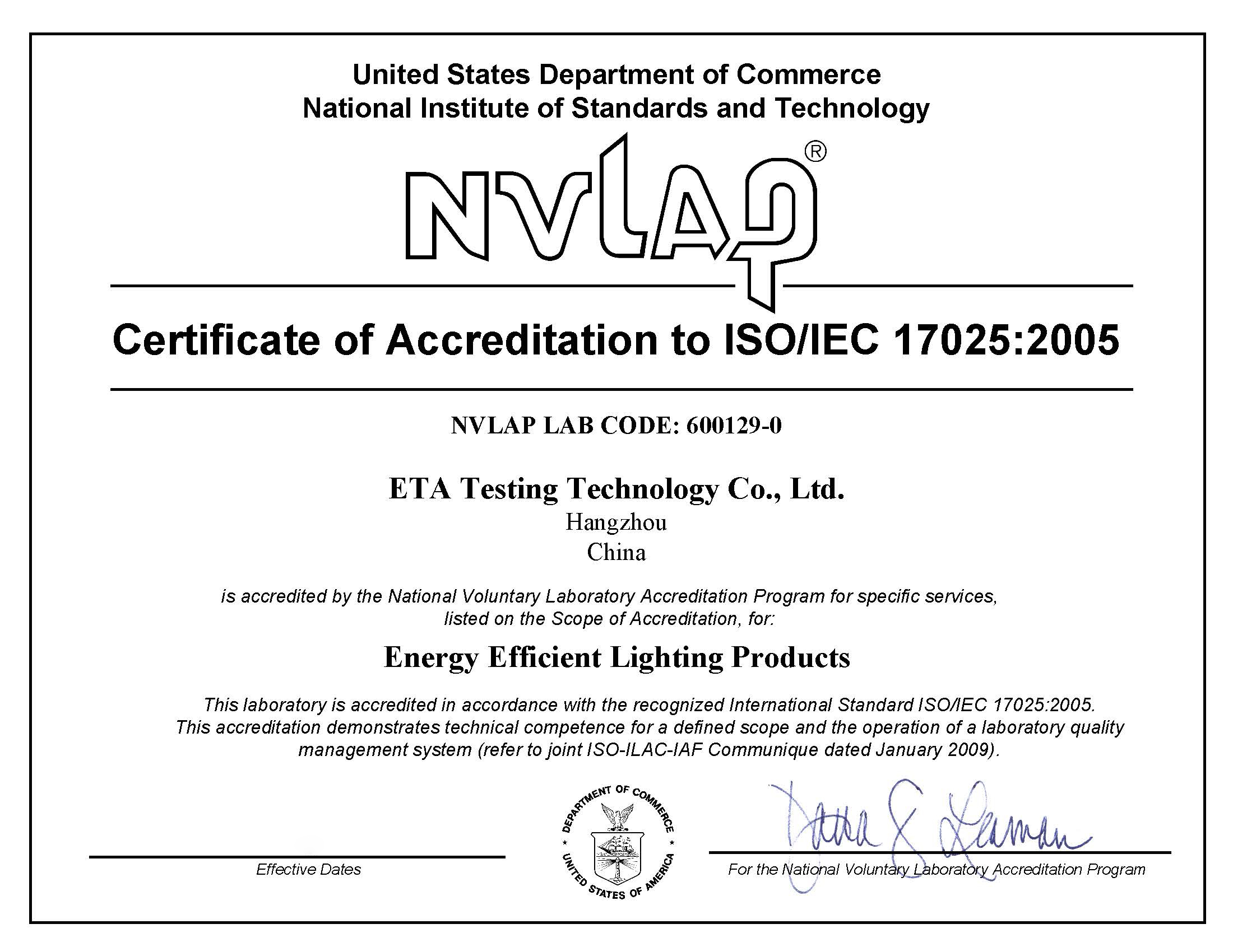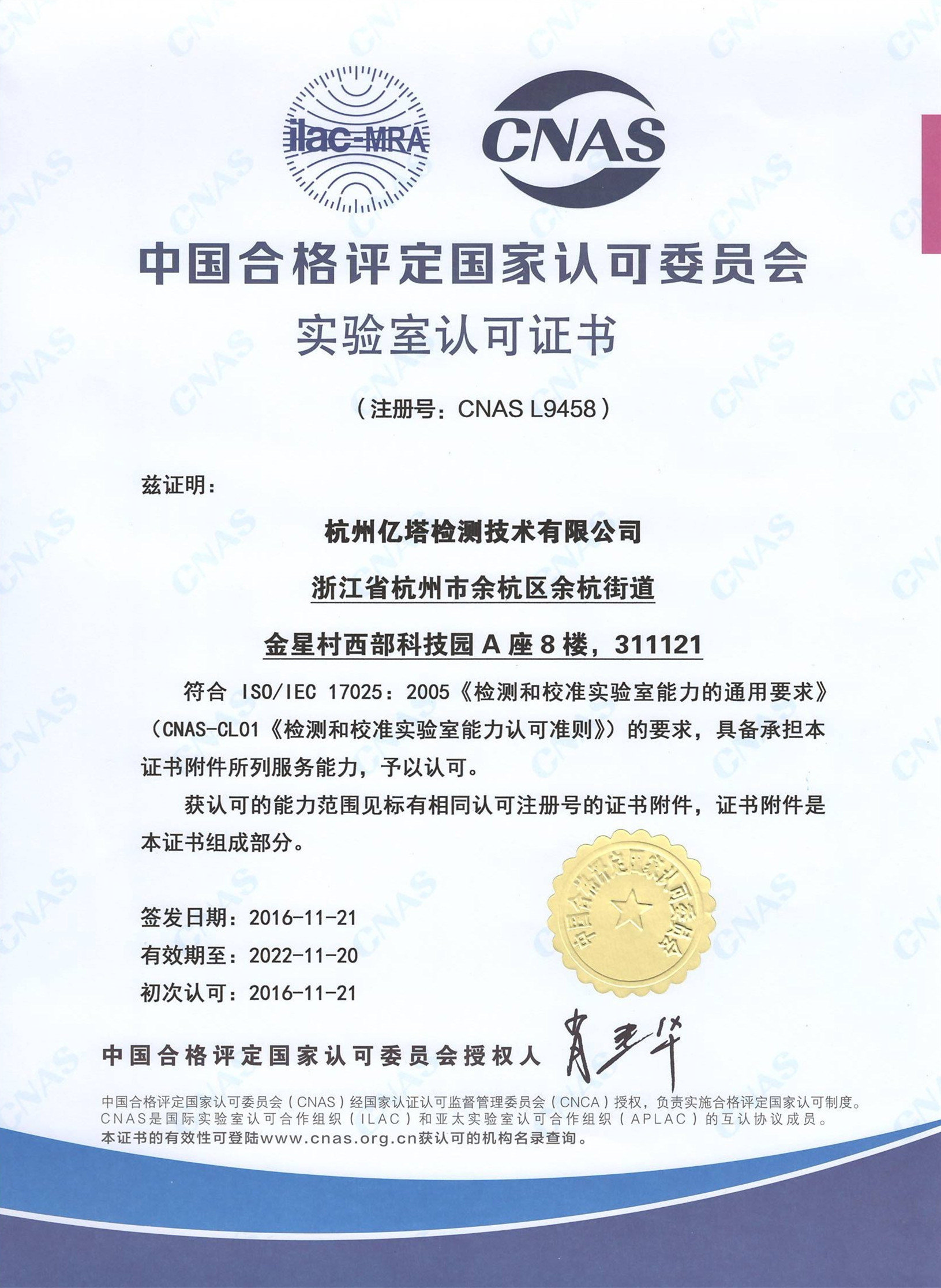 2015年4月杭州亿塔检测技术有限公司正式成立。 ETA Testing Technology Co., Ltd was registered.2015年6月安规性能实验室正式成立 Safety & Performance laboratory was established.2016年11月杭州亿塔技术检测有限公司顺利取得NVLAP资质和CNAS资质。 ETA Testing Technology Co.,Ltd passed NVLAP and CNAS accreditation.
